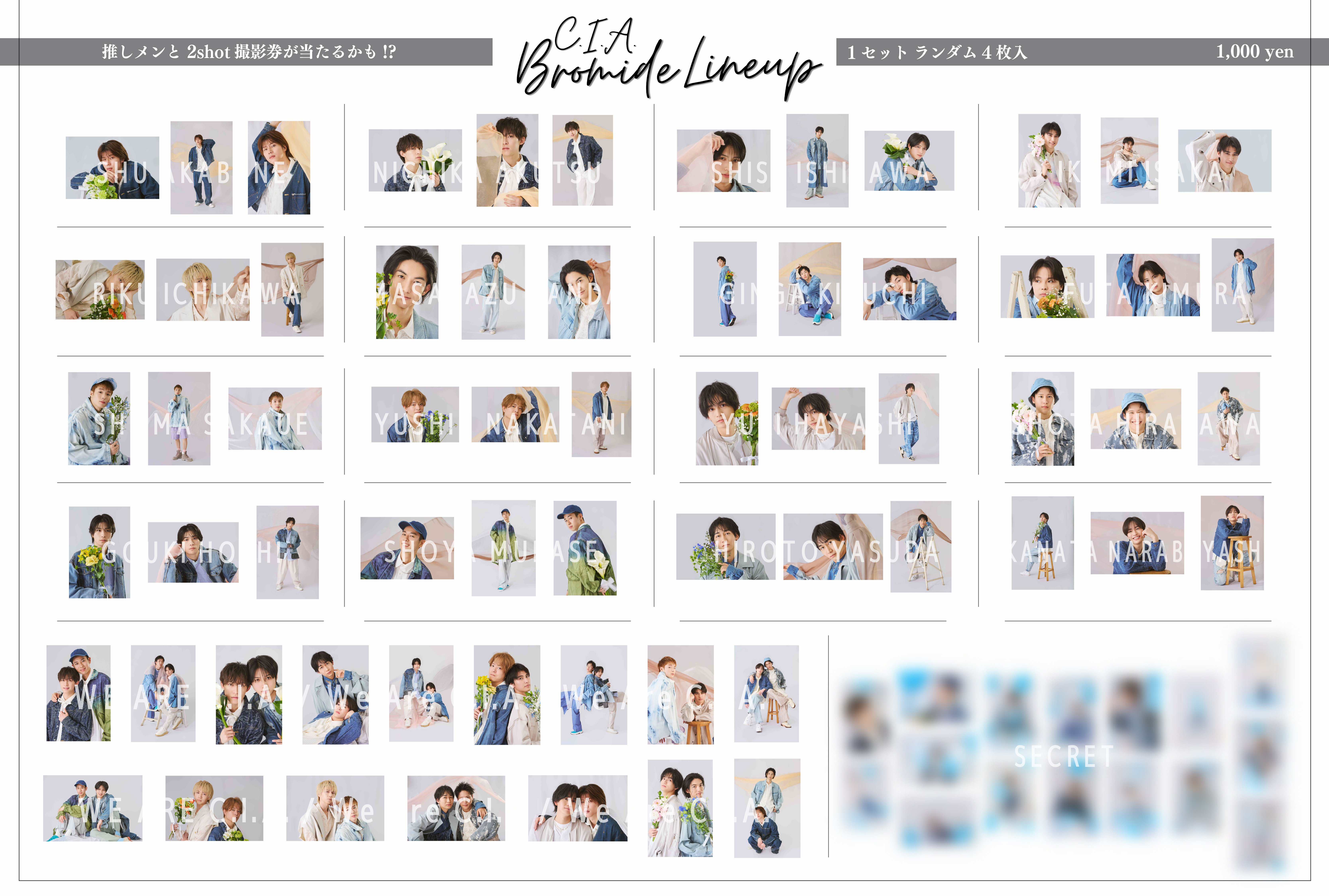 ・ブロマイドに、「撮影券」が封入されていた方は、各回終演後、“お好きなC.I.A.メンバーとの2shot撮影会”にご参加いただけます。当たりが出た方は、開演までにグッズ販売窓口へお持ちいただき、スタッフに【お名前・座席番号・2shot撮影希望メンバー】をお伝えください。